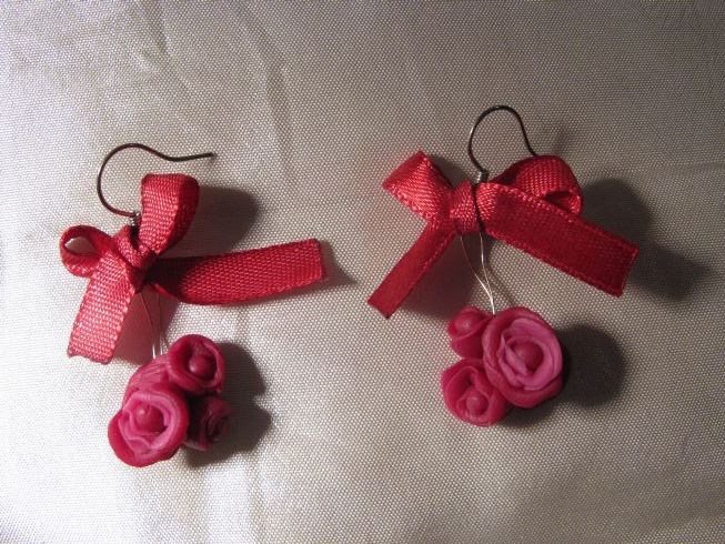 Drobné náušnišky vyrobené z hmoty Cernit. Na každé náušnici je trojice růží ozdobená červenou saténovou stužkou. Háček i závěs jsou ze stříbrného kovu. Velikost náušnice je cca 1,5 cm.